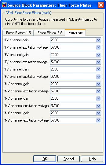 Each floor force plate uses a AMTI MSA-6 Strain Gage amplifier. It is assumed that all nine force plate amplifiers (MSA) are tuned (in terms of their jumper configuration setting the 6 channel gains and the 6 channel excitation gains) the exact same way for all 9 force plates.