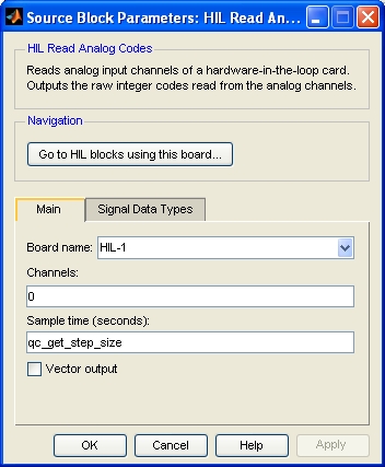 The HIL Read Analog Codes block reads the specified analog channels every time the block is executed. The channels are read immediately. The output is the raw codes from the analog-to-digital converters. The meaning of the integral codes depends on the hardware. This block is useful for prototyping fixed-point control algorithms and for teaching purposes.