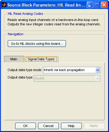 The HIL Read Analog Codes block outputs signals of type int32, uint32 or double.