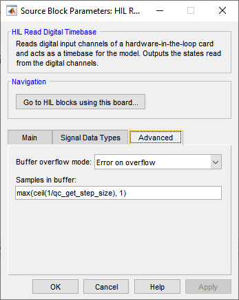 The number of samples in the task buffer. Timebase blocks are implemented as HIL tasks. Tasks operate as separate "threads" in the driver for the card that read data from the hardware at a given rate. The data read is stored in the task buffer. If the task buffer overflows then the block typically stops the model with an error, although this behaviour can be changed using the Buffer overflow mode parameter. Each time the block executes, it reads one sample from the task buffer. If there is no data in the task buffer then it waits until a sample arrives. Hence, the block synchronizes the diagram to the sampling rate of the task. Making the number of samples in the task buffer greater than one allows the sampling rate to temporarily exceed one sampling interval, which is useful for normal simulation.