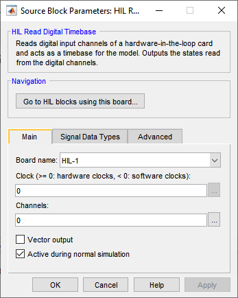 The HIL Read Digital Timebase block reads the specified digital channels at every sampling instant. The timebase for the model is provided by the block itself. Only one HIL Timebase block may appear in the model. Multiple timebases for a model are not supported.