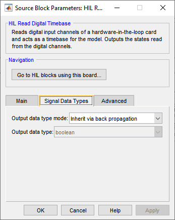 The HIL Read Digital Timebase block outputs signals of any of the built-in Simulink datatypes, except fixed point. See the Signal Data Types pane below for information on how the output data type is determined.