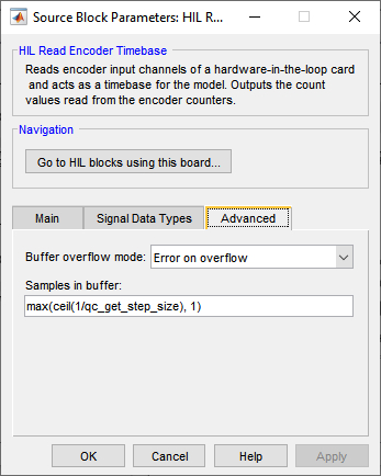 The number of samples in the task buffer. Timebase blocks are implemented as HIL tasks. Tasks operate as separate "threads" in the driver for the card that read data from the hardware at a given rate. The data read is stored in the task buffer. If the task buffer overflows then the block typically stops the model with an error, although this behaviour can be changed using the Buffer overflow mode parameter. Each time the block executes, it reads one sample from the task buffer. If there is no data in the task buffer then it waits until a sample arrives. Hence, the block synchronizes the diagram to the sampling rate of the task. Making the number of samples in the task buffer greater than one allows the sampling rate to temporarily exceed one sampling interval, which is useful for normal simulation.