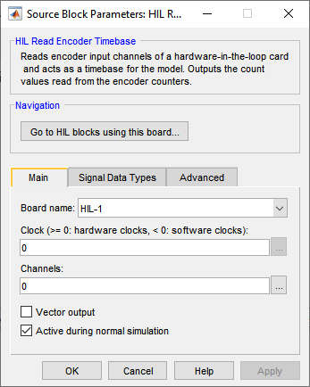The HIL Read Encoder Timebase block reads the specified encoder channels at every sampling instant. The timebase for the model is provided by the block itself. Only one HIL Timebase block may appear in the model. Multiple timebases for a model are not supported. The output is the count values from the encoders.