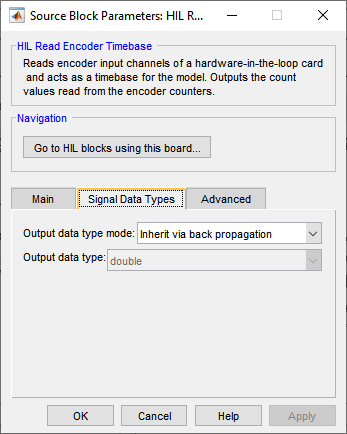The HIL Read Encoder Timebase block outputs signals of type int32 or double. See the Signal Data Types