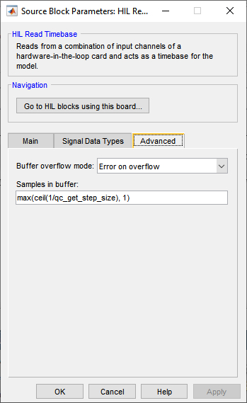 The number of samples in the task buffer. Timebase blocks are implemented as HIL tasks. Tasks operate as separate "threads" in the driver for the card that read data from the hardware at a given rate. The data read is stored in the task buffer. If the task buffer overflows then the block typically stops the model with an error, although this behaviour can be changed using the Buffer overflow mode parameter. Each time the block executes, it reads one sample from the task buffer. If there is no data in the task buffer then it waits until a sample arrives. Hence, the block synchronizes the diagram to the sampling rate of the task. Making the number of samples in the task buffer greater than one allows the sampling rate to temporarily exceed one sampling interval, which is useful for normal simulation.