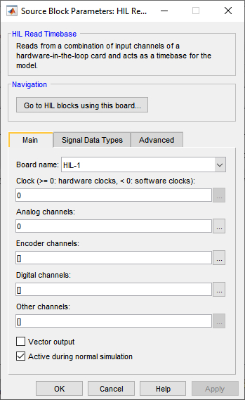 The HIL Read Timebase block reads the specified channels at every sampling instant. The timebase for the model is provided by the block itself. Only one HIL Timebase block may appear in the model. Multiple timebases for a model are not supported. This block can read more than one type of channel at the same time. Using this block is more efficient than using separate blocks for each channel type when more than one type of channel is being read.