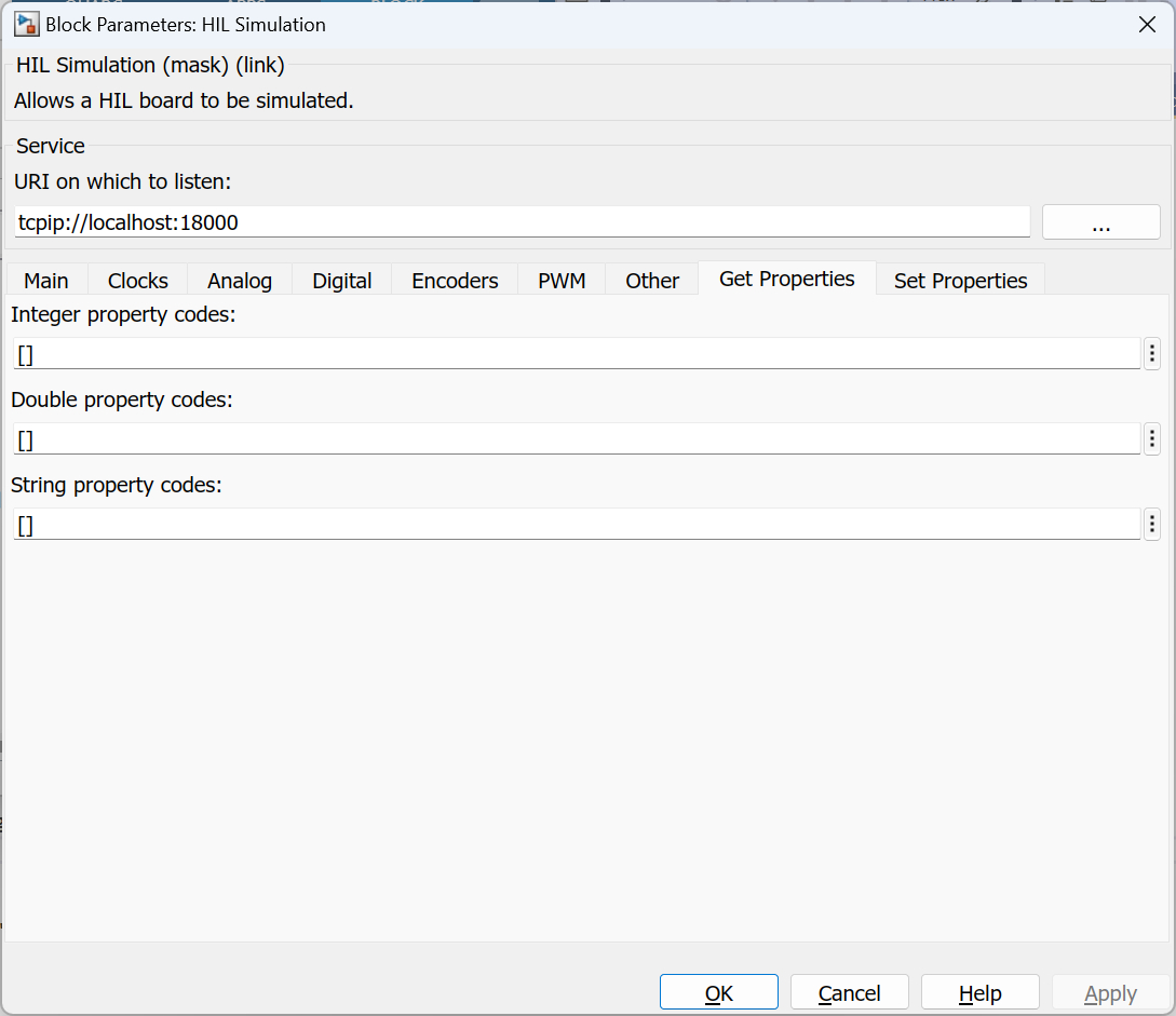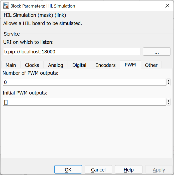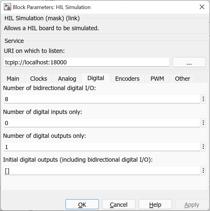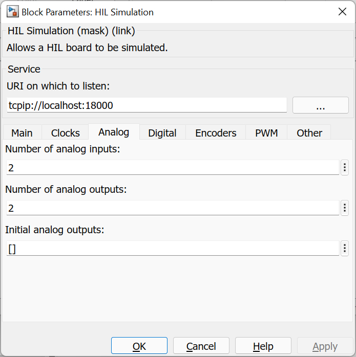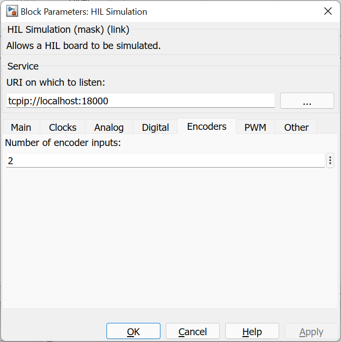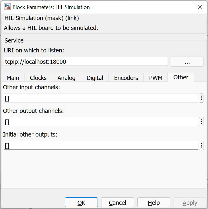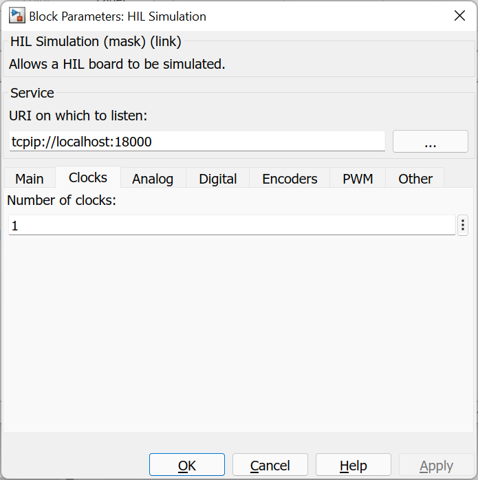 Also set the Universal Resource Identifier (URI) to indicate the communication channel on which the HIL Simulation block will listen for client connections, such as tcpip://localhost:18000. QUARC uses URI's for all its communications because it provides a uniform, extensible and flexible means of identifying the communication protocol to use and the associated communication parameters. Refer to Universal Resource Identifiers for more information.