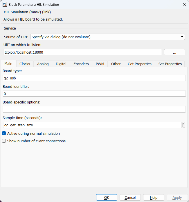 For example, suppose we have a model simulating Q2-USB board 0 using the HIL Simulation block and we wish to use TCP/IP to communicate between the model simulating the board and the model using the board. In this case, in the model simulating the card, we may set the URI on which to listen parameter to tcpip://localhost:18000 so that the TCP/IP protcol is used with port 18000. The Board type parameter will be q2_usb and the Board identifier parameter will be 0.