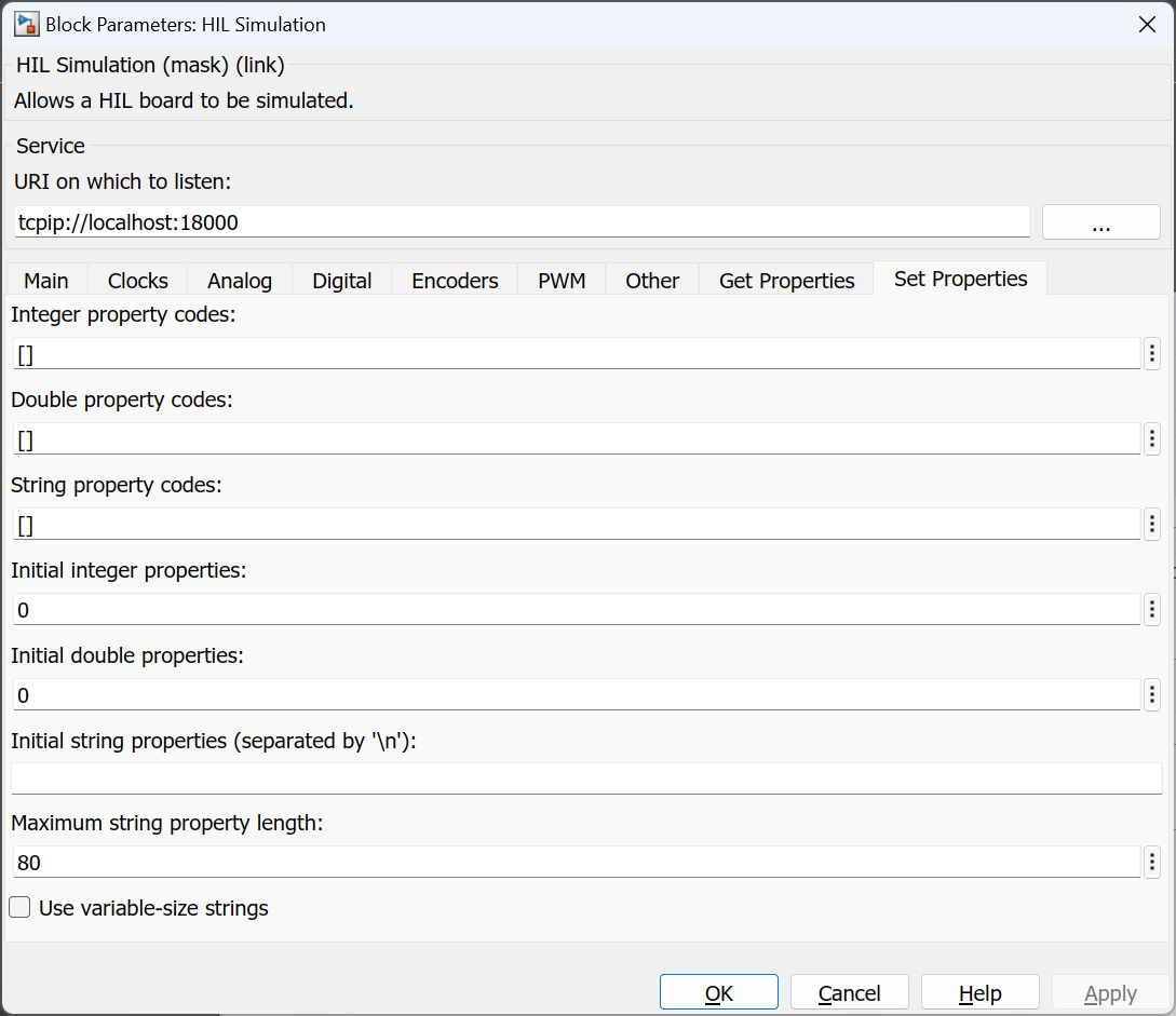 A uint8 array of characters for string property <n>, where n is one of the property codes in the String property codes parameter under the Set Properties tab. The values produced at this output port are set to the values from the Initial string properties parameter at model start. The output will then take on the string value set via a HIL Set Property block in the model using the simulated board. If the string property codes are an empty vector then this port will not appear.