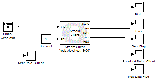 client. The block's output ports are connected to Scope
