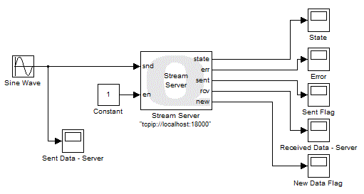 The fact that the scopes trace the desired signals verifies that the connection was indeed established and the two models are communicating with each other. There are important facts to mention here. First, these two blocks establish a "persistent" connection. If the connection is lost then these blocks attempt to re-establish the connection. For example, if you stop the client model while the server model is still running, you will notice that the "Received Data" scope of the server model becomes flat, meaning there is no new data being received. If you restart the client model, then the scope starts tracing the received data once again. Reconnecting to the client is possible because the server detected that the connection was lost and returned to waiting to accept a connection. This situation is depicted below.