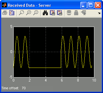 The flat line section on the scope corresponds to the time span for which the client was shut down. Likewise, if the server model is stopped, then the client model automatically reconnects when the server is restarted; the connection is persistent.