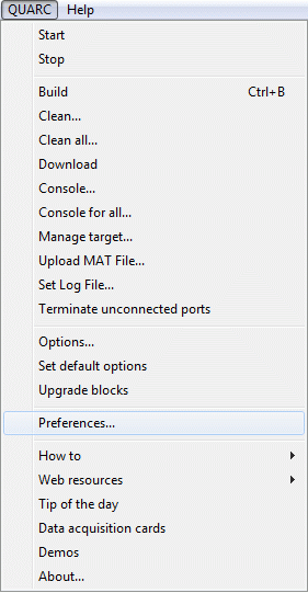 Different QUARC targets are currently supported in this version of QUARC. The default target type is set to the QUARC Windows target when you install QUARC. However, if you will most often be running your models on a different type of target, then it is convenient to change the default target type to that particular target type. One method to change the default target type is to use the QUARC Preferences Dialog. Perform the following steps to select the target type of your choice using the QUARC Preferences dialog: