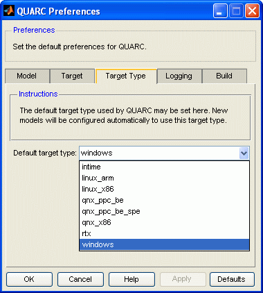 Select the Target Type tab in the QUARC Preferences dialog. Then choose the default target type from the list of target types provided.
