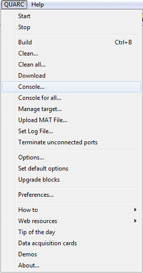 For more information about this option please refer to the Console section on the QUARC Menu page.
