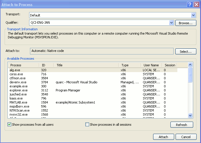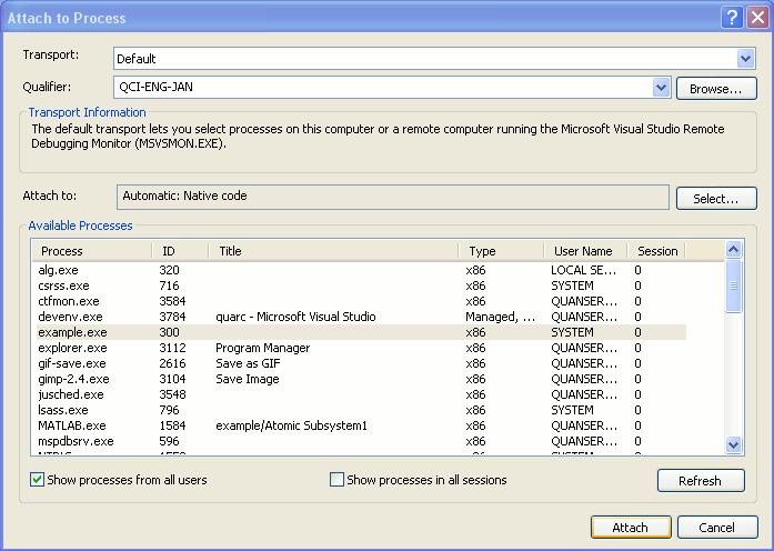 Select the process to which you wish to attach the debugger. In this case, it would be the real-time code generated for the model. The real-time process will have the name <model>.exe, where <model> is the name of your model. Select the real-time code process and click on Attach as depicted in the figure below. (The real-time code used for the purpose of this document is called example.exe).