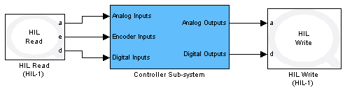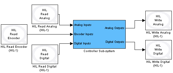 As seen in the above figure, the HIL Read block has been used to read analog, encoder and digital channels of the connected data acquisition board. The immediate I/O blocks read these channels immediately every time they are executed. The values read are manipulated in the Controller Sub-system and the calculated control commands are written to the data acquisition board's analog and digital channels. Reading from and writing to the channels seen in the figure above could also have been done using the HIL Read Analog, HIL Read Encoder, HIL Read Digital, HIL Write Analog and HIL Write Digital blocks separately, as illustrated below. However, in situations where different channels are being read using the immediate I/O blocks, it is more efficient to have a single HIL Read block rather than using multiple immediate I/O blocks specific to each channel type. The same principle applies to writing to different channel types where having a single HIL Write block is more efficient than using channel specific immediate I/O blocks. Not all boards support the HIL Read and HIL Write blocks though.