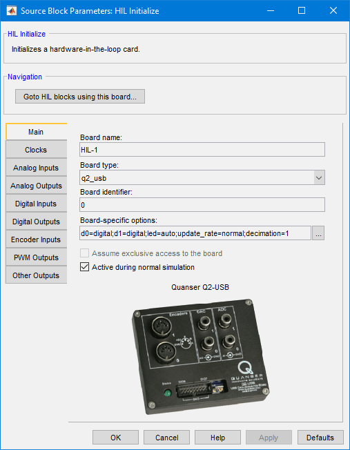 This block can be found in the Simulink Library Browser under the QUARC Targets/Data Acquisition/Generic/Configuration MATLAB Command Line Click to copy the following command line to the clipboard. Then paste it in the MATLAB Command Window: qc_open_library('quarc_library/Data Acquisition/Generic/Configuration'); library and should be placed in all models that require hardware access of some type. The block initializes a HIL board and associates a name with the board. The dialog box for the HIL Initialize block is depicted in the figure below.