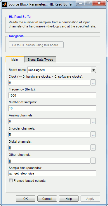 If different channels such as analog, digital or encoder are to be read with the buffered I/O HIL blocks, it is more efficient to have a single HIL Read Buffer block rather than using multiple buffered I/O blocks specific to each channel type. The dialog box for the HIL Read Buffer block is depicted below.