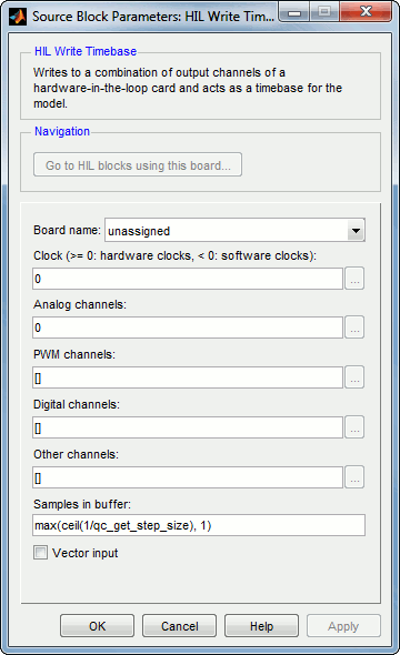 Similar to buffered and immediate I/O HIL blocks, if more than one channel type is being read using the HIL Timebase blocks, it is more efficient to use a single HIL Read Timebase block rather than using one timebase for a specific channel type and multiple immediate I/O read blocks specific to the other channel types. The same principle applies to writing to different channel types where having a single HIL Write Timebase block is more efficient than using one channel-specific HIL Timebase block and multiple immediate I/O blocks. The dialog box for the HIL Write Timebase block is shown below.