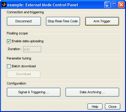 You can manually arm or disarm the trigger signal while connected to the real-time code. The trigger signal is monitored for trigger events if you arm the trigger. Disarming the trigger disables monitoring of the trigger signal. Arming/disarming can be done using the External Mode Control panel. Below is an illustration of this panel.