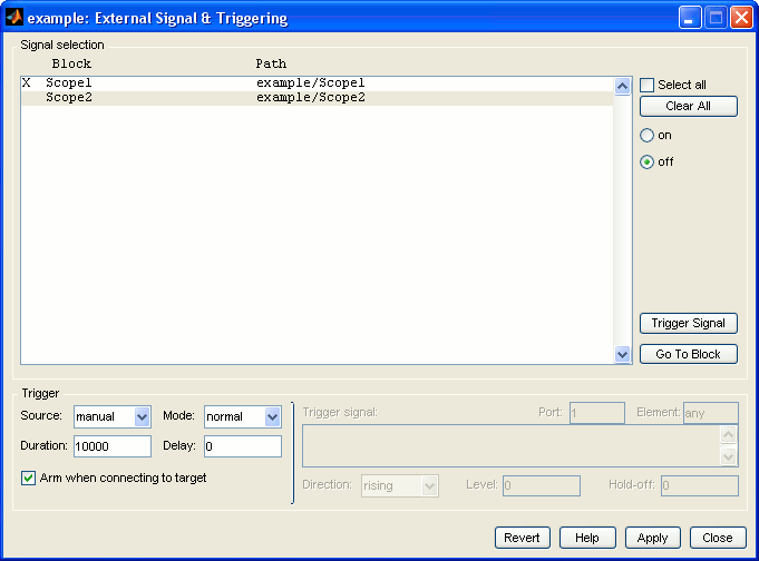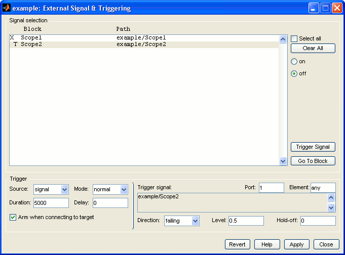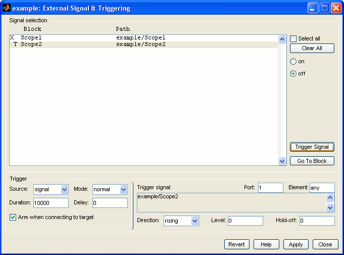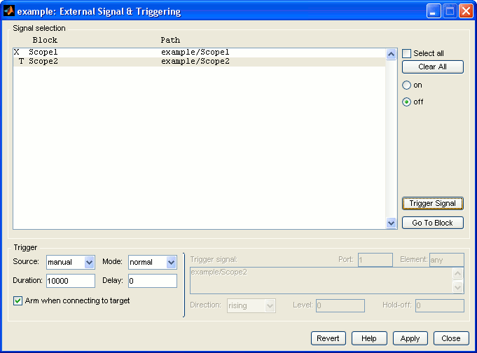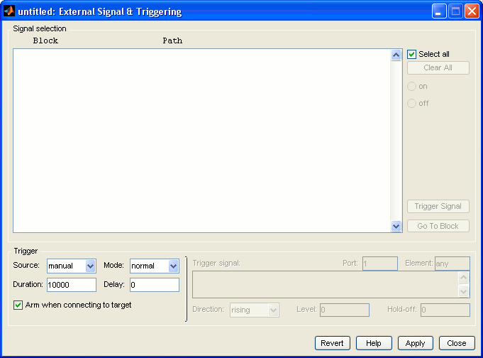 Signal triggering is configured through the "Signal & Triggering" dialog accessible from the External Mode Control Panel. An overview of this dialog will be provided, along with a discussion of how to configure a trigger event and how to manually arm or disarm a trigger. Use the following list to refer to each topic: