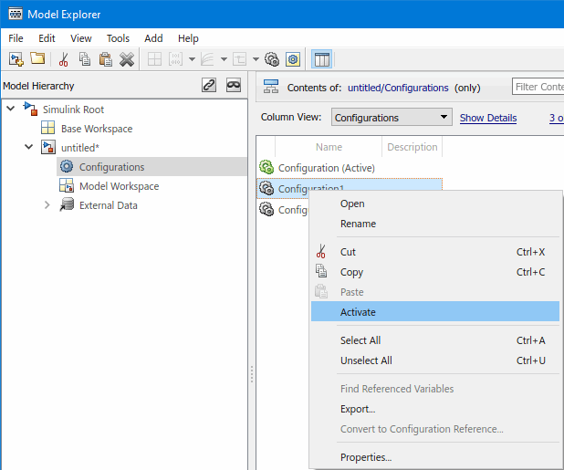 When a Simulink model defines more than one configuration, only one of those configurations is used at a time for simulation and code generation. The configuration currently in use is called the active configuration. The icon associated with the active configuration is a different color than the other configurations in the Model Hierarchy pane of Model Explorer.