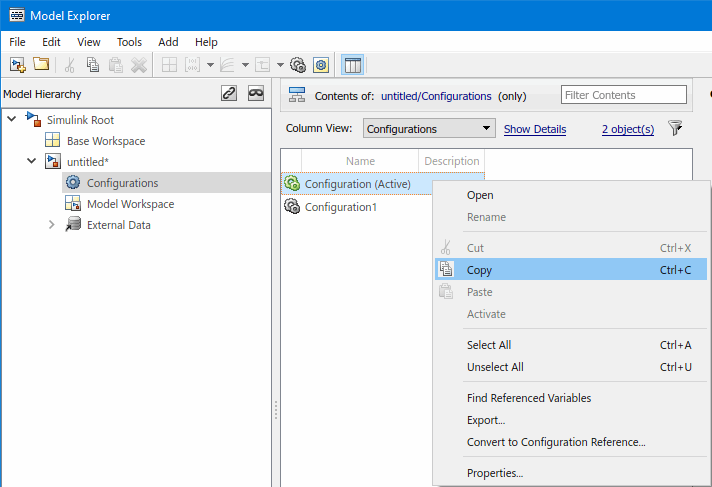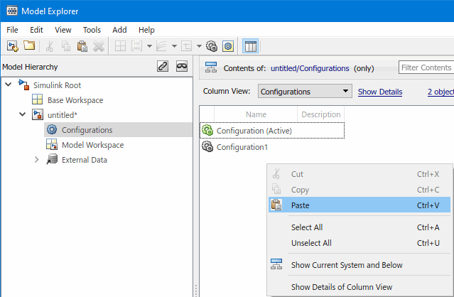 Configurations may also be copied by right-clicking on a and choosing from the context menu. Then right-click in the model's Configurations content area and choose from the context menu.