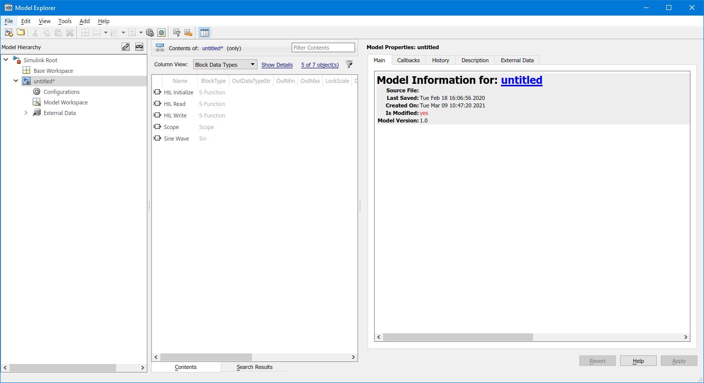 Quanser recommends becoming familiar with the Model Explorer interface because of its many advantages over the traditional Configuration Parameters dialog.