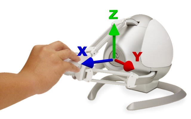 Haptic devices share the same axes definition as manipulators. For the default configuration, the positive x direction is towards the robot's typical workspace. From a user's perspective, the positive x is typically towards the user. The z direction is perpendicular to the base mounting, and the y direction is the cross product. Refer to the specific device page to determine what is considered the default configuration.