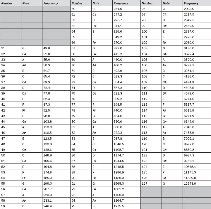 in the song (1 to 16). Each song can contain up to sixteen notes. Each note is associated with a note number (31 to 127) that uses MIDI note