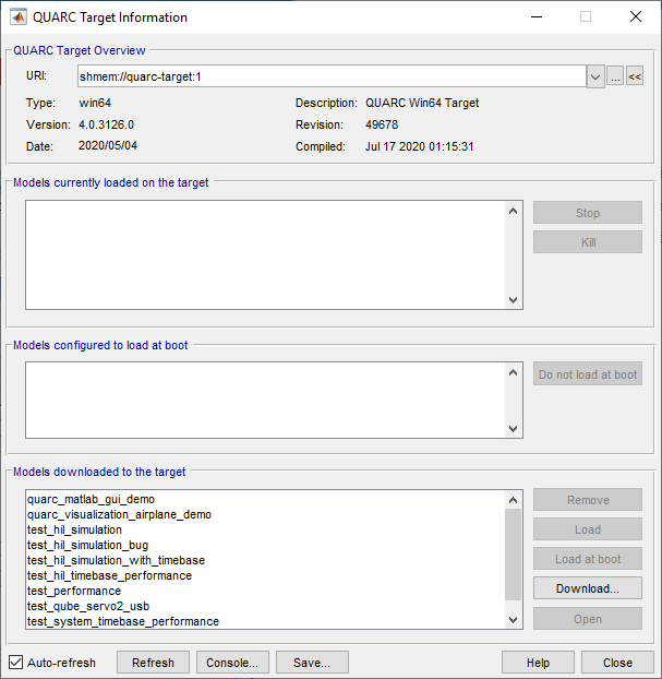 The next section of the dialog shows a list of all the models currently loaded on the target. Since this list can change dynamically, the QUARC Target dialog updates the list periodically, provided the option is checked. To manually update the list, press the button.