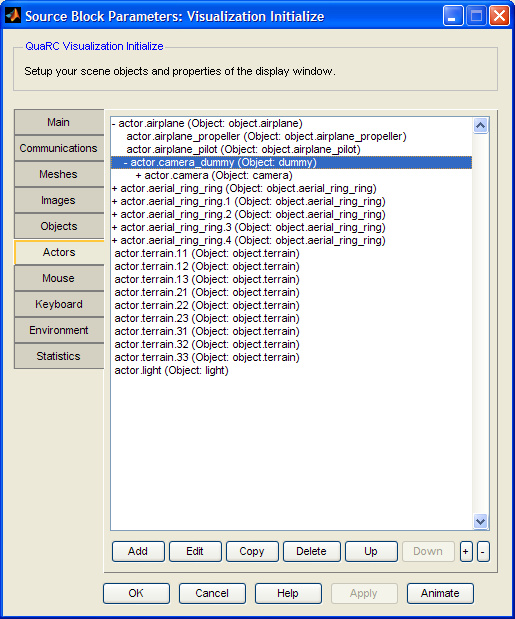 After adding an object to the pool, you can click the button to modify the actor parameters, or you can click the button to remove an actor. The button will duplicate the existing selected actor. The and buttons can be used to rearrange the order of the actors between siblings. As you create a hierarchical structure with parent-child relationships, the actor list will arrange itself into a tree structure. Clicking on an actor with a "+" next to it while holding down the Alt key will expand the tree. The "+" and "-" buttons at the bottom will expand or collapse the entire tree. Double-clicking on an actor will allow the actor to be edited.