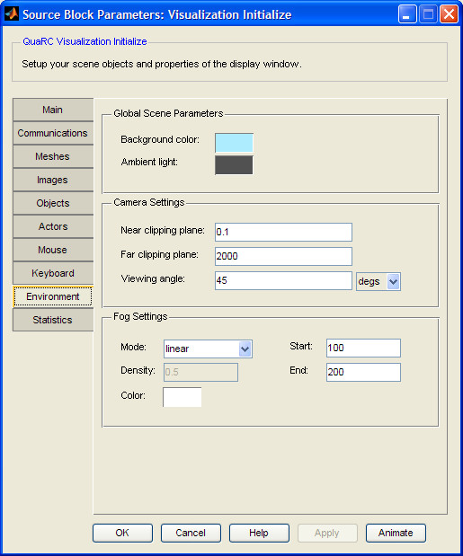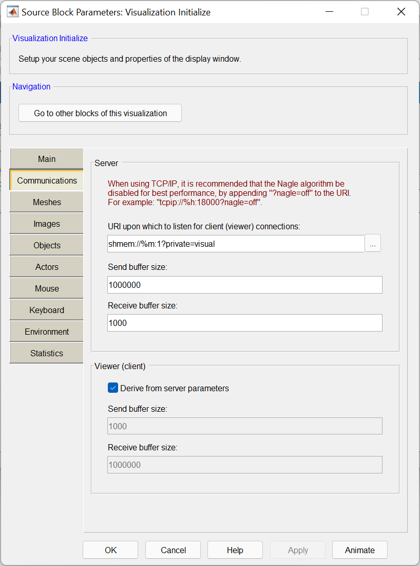 The Visualization Initialize block has two primary roles. The user interface of the Visualization Initialize block is primarily used to generate a scene file which defines what meshes and textures will be used to compose the visualization and how they interrelate. The underlying function of the Visualization Initialize block is to act as a communications server. It collects all the data from the various Set Variables blocks in the model and sends it to all the connected viewers via the selected protocol.