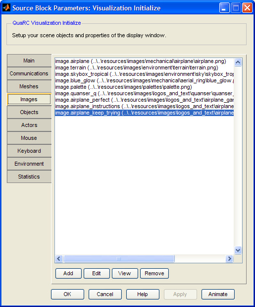 Bitmaps can be created with any paint program that supports these formats. You can use packages such as the open-source image editor GIMP, commercial packages such as Adobe's Photoshop, or even Microsoft Paint in Windows. A number of images which are designed to work with the included x3d files are also included in the $(QUARC_DIR)/resources/images MATLAB Command Line Click to copy the following command line to the clipboard. Then paste it in the MATLAB Command Window: dos(sprintf('explorer.exe "%s" &', fullfile(qc_root, 'resources', 'images'))); folder.