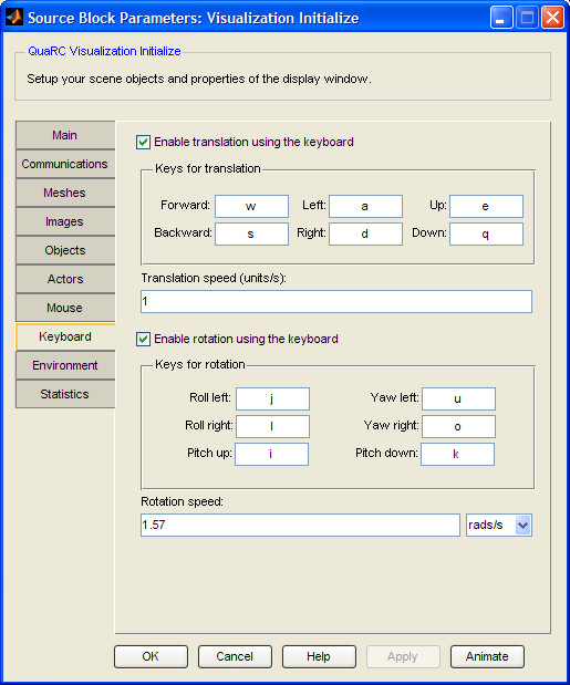There are three axes (six directions) that can be configured for translation. By clicking the mouse in one of the fields then pressing the desired key, the default key will be changed.