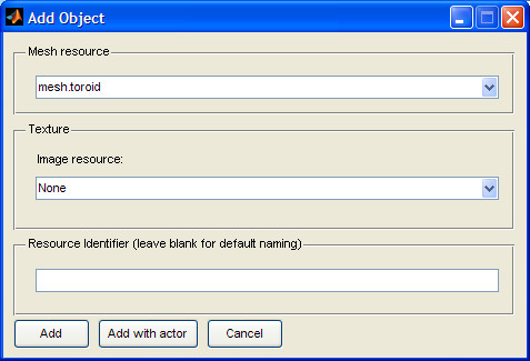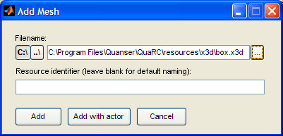 After you have selected your file, you can either manually enter a resource identifier that will be used to identify the mesh from the Add object dialog, or you can leave it blank in which case the name "mesh.filename" will be assigned.