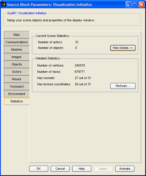 The statistics tab gives you some basic information about the scene so you can estimate the computational load. The initial information you are presented with is the total number of actors and objects. Clicking the button will scan all of the mesh files referred to by the objects and return the total number of vertices and faces for all the actors in your scene. It will also indicate how many of the actors have normals and texture coordinates (the camera and lights never have texture coordinates or normals).